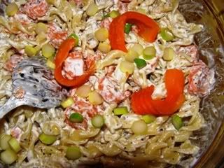 Makarone prohladiti, pomešati sa iseckanom šargarepom i mladim lukom i preliti mešavinom pavlake.