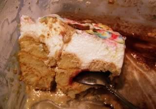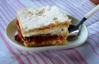Za treću koru umutiti čvrst sneg od 3 belanca, dodati 3 žumanca i 3 kašike kristal šećera. Kada se šećer u potpunosti istopi dodati 3 kašike brašna, lagano izmešati i presuti u kalup.