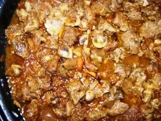 Iseći na kocke meso i slaninu, pa staviti u zagrejanu šerpu. Pržiti oko 5 minuta na srednjoj temperaturi, i dodati sitno iseckan crni luk i list lovora. Dobro izmešati i naliti oko 100 gr vode. Poklopiti i dinstati na tihoj vatri oko 45 minuta. Dodati šargarepu isečenu na kolutove, šampinjone isečene na četvrtine i belo vino. Izmešati, poklopiti i dinstati još 45 minuta. Povremeno proveriti da li je tečnost isparila i po potrebi dodati malo vode. Začin od povrća i alevu papriku izmešati sa 2-3 kašike hladne vode, sipati u šerpu, izmežati i kuvati narednih 15 minuta. Poslužiti toplo uz prilog od testenine i sezonske salate.