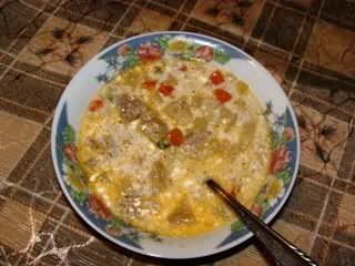 Procediti, pa meso i povrće iseckati, preliti jajetom razmućenim sa kiselom pavlakom i supom. Izmešati i poslužiti toplo.