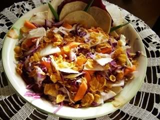 Obe vrste kupusa iseći na rezance, šargarepu na štapiće a celer na listiće. Posoliti, dodati ulje i sirće, dobro izmešati i ostaviti desetak minuta na hladnom. Neposredno pred služenje posuti kukuruznim pahuljicama i ukrasiti po želji.