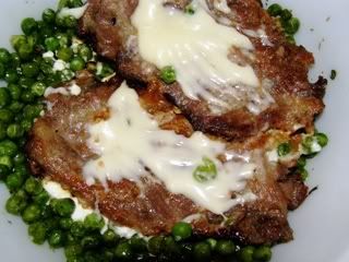U dublji sud sipati ostatk ulja i sitno seckane obe vrste luka. Propržiti 2-3 minuta pa dodati grašak. Sipati začin od povrća i šoljicu vode, pa dinstati na tihoj vatri 20 minuta. Umešati puter i kiselu pavlaku, pa preručiti u vatrostalnu činiju. Odozgo staviti meso i topljeni sir. Zapeći u rerni desetak minuta, ili samo zagrejati u mikrotalasnoj 2 minuta.